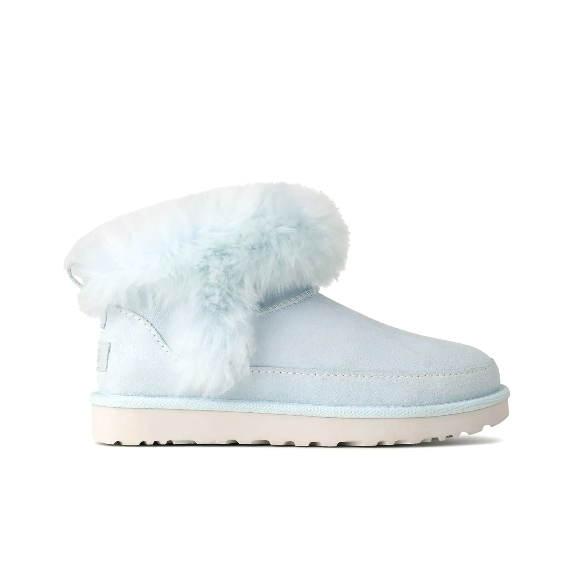 Our Classic Ultra Mini is one our most coveted Classics, and we've made it even more cozy with our Classic Ultra Mini Chalet. Featuring the same lower shaft you love about the original, this one is trimmed in fluffy sheepskin for a full mountain town "moment." It's crafted with rich suede set atop a lightweight sugarcane EVA outsole, and inside you'll be wrapped up in the warmth of our soft UGGplush™ lining from upcycled wool.